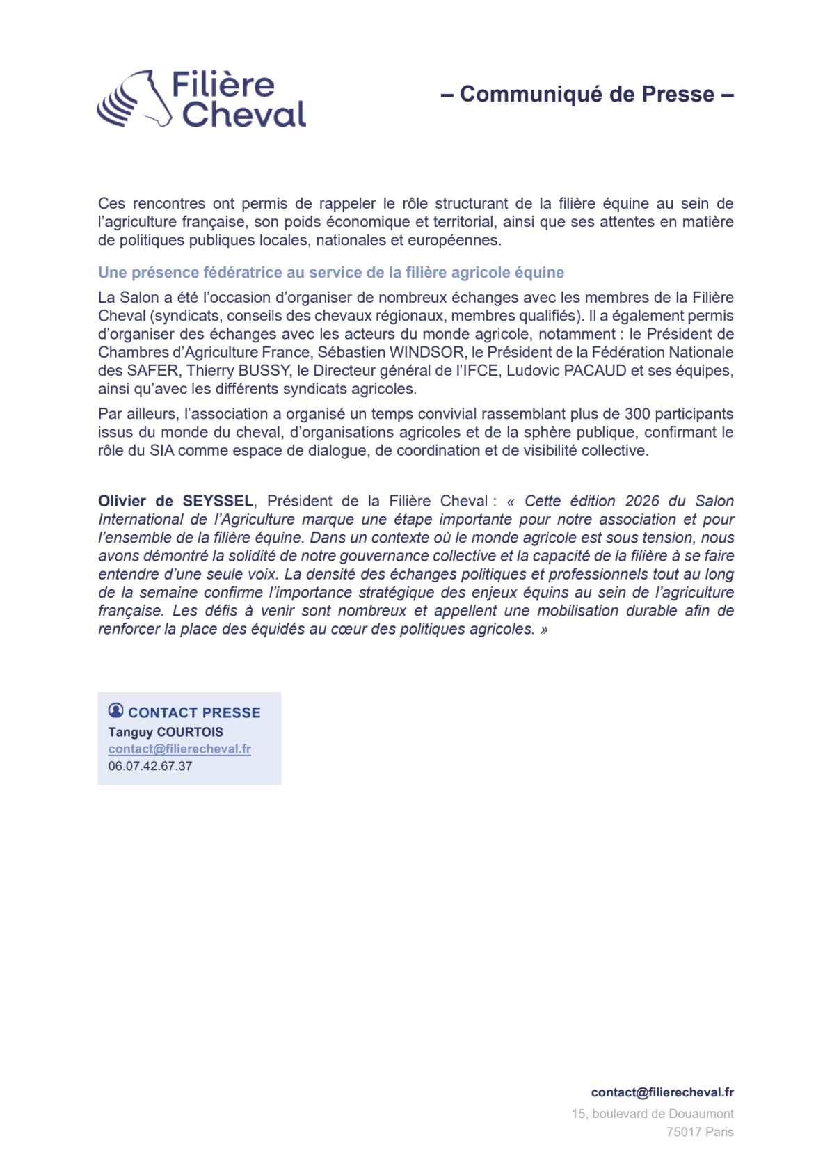 Une présence forte qui illustre le rôle structurant de la filière équine dans l’agriculture française et sa volonté de porter une voix unie pour relever les défis à venir. 🇫🇷🌱